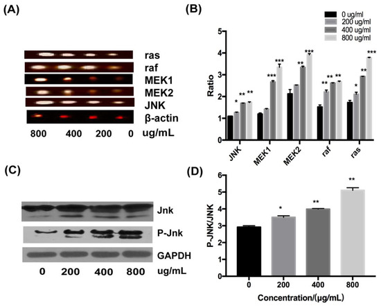 The role of the JNK signal pathway in the induction of apoptosis in HT-29 cells was determined by RT-PCR and Western blotting. At the mRNA level, the expression of ras, raf, MEK1, MEK2, and JNK were upregulated with increasing concentrations of fucoidan (Figure 7A,B). Moreover, fucoidan increased the level of JNK protein and its phosphorylated form, P-JNK, in a dose-dependent fashion, as assessed by Western blot analysis (Figure 7C); the ratio of p-JNK/JNK increased from 2.9 to about 5.2 at 800 μg/mL (Figure 7D). Therefore, the JNK signaling pathway was essential for the activation of apoptosis of HT-29 cells by fucoidan.