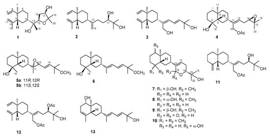The terpenoids containing fractions of the EtOAc extract of L. varium were repeatedly purified using a series of chromatographic techniques, including HPLC, to afford compounds 1–13 (Figure 1). The structures of the new compounds (1–11) were established on the basis of NMR data (Table 1, Table 2 and Table 3) and spectroscopic analyses (Supplementary Materials, Figures S1 to S79).