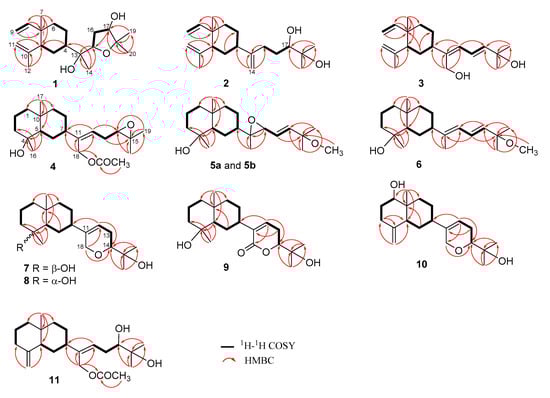 Lobovarol F (1) was found to possess a molecular formula C20H34O3 as established by high-resolution electrospray ionization mass spectrometry (HRESIMS, m/z 345.2403, [M + Na]+), indicating four degrees of unsaturation. The IR absorption at 3393 cm−1 designated the presence of the hydroxy group. The NMR signals (Table 1) showed the presence of a vinyl (δC 150.0, CH and 110.0, CH2; δH 5.80, dd, J = 18.0, 10.4 Hz, 4.90 d, J = 10.4 Hz, and 4.89, br d, J = 18.0 Hz), an isopropenyl (δC 147.6, C; 112.1, CH2 and 24.9, CH3; δH 4.83 and 4.59, each 1H, s; and 1.71, 3H, s); a ring-juncture methyl (δC 16.6, CH3; δH 0.99, 3H, s) and methine (δC 52.4, CH; δH 1.98, m) of a β-elemene segment of lobane-type diterpenoids [1,2,3]. Thus, the proton signals at δH 1.30, 1.26, and 1.15 (each 3H, s) should be the methyls attached to the oxygen-bearing carbons of the side chain. The analysis of correlations spectroscopy (COSY) and heteronuclear multiple bond correlation (HMBC) led to the establishment of a 2,2-dimethyl-3-hydroxytetrahydrofuran attached to a methyl-bearing oxygenated carbon (δC 75.0, C-13) to form the side chain of 1 (Figure 2). Accordingly, the HMBC correlations from H3-14 (δH 1.26) and from both H3-19 and H3-20 (δH 1.15 and 1.30) to the downfield shifted oxycarbons (δC 80.4, CH and 84.0, C), respectively, assigned the 15,18-ether linkage of the tetrahydrofuran ring. Moreover, the HMBC correlations observed from H3-14 and from both of H3-19 and H3-20 to oxycarbons (δC 75.0, C and 76.6, CH) positioned the two hydroxy groups at C-13 and C-17, respectively.