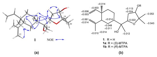 (a) Key nuclear Overhauser effect (NOE) correlations of 1; (b) 1H NMR chemical shift differences ∆(δS − δR) in ppm for the MTPA esters of 1.