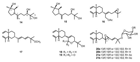 Known sequiterpenoids chokol E (14) and 10-epi-chokol E (15); lobane diterpenoids (16–19); fuscosides C and D (20a and 20b), and fuscosides C and D acetates (21a and 21b).