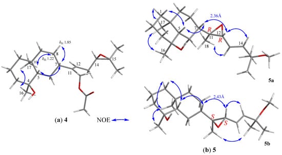 (a) Selected NOE correlations of 4; (b) Selected NOE correlations of 11,12-bisepimers.