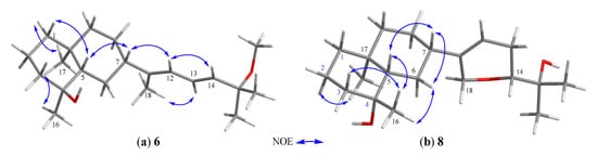 The HRESIMS of lobovarol M (8) showed the same molecular formula C20H34O3 as that of 7, suggesting 8 to be an isomer for 7. The NMR data of 8 were found to be very similar to those of 7 (Table 2); however, 8 exhibited more upfield chemical shifts for carbons around C-4, in particular C-2, C-3, and C-5 (∆δC −2.1, −2.1, and −3.1, respectively) relative to the correspondent carbons in 7, supporting that 8 is the 4-epimer of 7. Unlike the NOE correlations of 7, 8 exhibited correlations (Figure 6b) between H3-17 and H-2α, but not between H3-17 and H3-16. Also, H3-16 showed NOE interactions with both H-3β and H-5, and H-5 displayed correlation with the β-oriented H-7, thus 8 was determined as 4-epimer of 7.