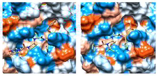It is interesting to note that these compounds could represent Michael acceptor covalent inhibitors. In fact, the conjugate bond is located at a distance of about 4 Å from Cys145, suggesting that both pseudotheonamides (12 and 17) could form a covalent bond with Cys145. These pseudotheonamides have been isolated from the marine sponge Theonella swinhoei and have shown good inhibitory activity on the serine protease [27]. Consequently, after having covalently linked the compounds 12 and 17 with the Cys145 residue, a short (2 ns) MD simulation was performed in order to stabilize the new complex. The lower energy system was further minimized, and covalent docking was performed. The binding energy of 12 and 17 is very similar (−14.9 kcal/mol and −14.4 kcal/mol, respectively) with a significant increase compared to the non-covalent interaction. The two compounds adopt a similar pose within the catalytic site, establishing H-bonds with the Asn142, Ser144, and Glu166 residues, while the benzyl groups settle into the hydrophobic pockets (Figure 6b,c). Peptidomimetic derivatives contain Michael acceptors as warheads are an essential class of cysteine protease inhibitors. In general, inhibitor design strategies involve the replacement of a substrate scissile amide bond with an appropriate Michael acceptor group. The cysteine residue undergoes 1,4-addition to the inhibitor at the Michael acceptor warhead group, and the subsequent protonation of the α-carbanion results in the irreversible inhibition of the enzyme [28,29,30].