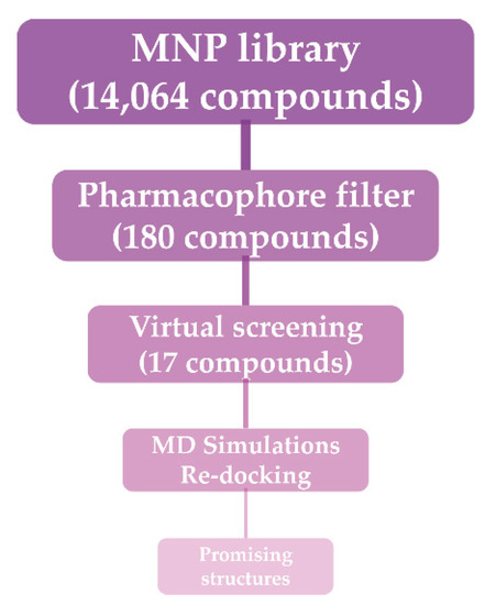 Here, we described the screening of a collection of MNP (14,064 compounds) in search of new, potential SARS-CoV-2 Mpro inhibitors. Structure-based and ligand-based drug design approaches have been exploited as valuable drug discovery tools, owing to their versatility and synergistic character [43,55,56].