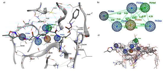 (a) Pharmacophore model generated by the Pharmit server, including hydrogen bond donors (DON) (blue spheres), negatively charged oxygen atom to represent a hydrogen bond acceptor (ACC) (orange sphere) and the hydrophobic center (HYD) (green sphere); (b) 3D spatial distribution of the six pharmacophore features; (c) Six features of the pharmacophore model on the 17 aligned compounds.