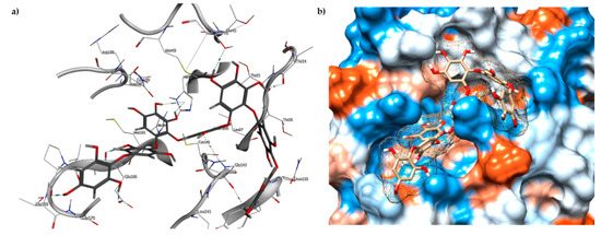 Another class of promising Mpro inhibitors has been identified in flavonoids such as Apigenin-7-O-neohesperidoside, Luteolin-7-rutinoside, and Resinoside. These compounds are also widespread on terrestrial plants and in food waste with good anti-tumor, anti-inflammatory, and antioxidant activity [31,32,33,34,35]. Among these, Apigenin-7-O-neohesperidoside or Rhoifolin (whose structure belongs to flavone glycoside and its aglycone is apigenin, while the neohesperidose disaccharide constitutes the glycosidic structure) has the best binding energy (−12.39 kcal/mol). The docking pose of apigenin (Figure S8) shows H-bonds between the aromatic region and residues Leu141, Glu166, and Thr190, establishing a π-stacking interaction with Gln189. In SARS-CoV-1 Mpro it has been shown that the Gln189 mutation negatively affects inhibitory activity, suggesting that this area of the protein plays a key role in the binding interaction [36].