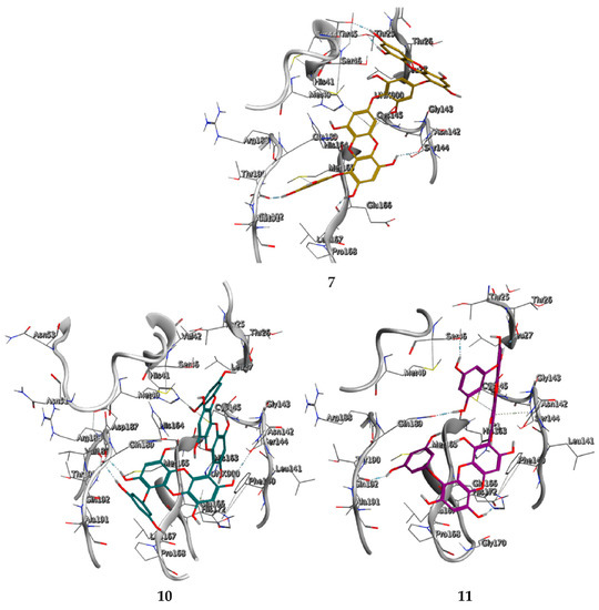 Interaction profile of the best-docked poses for compounds 7, 10, and 11.