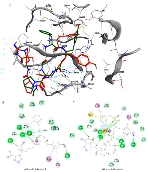 (a) Comparison between the binding pockets of the crystalline structure of the N3 inhibitor linked to the severe acute respiratory syndrome coronavirus 2 (SARS-CoV-2) main protease (Mpro) (PDB ID: 6LU7); (b) the crystal structure of TG-0205486 inhibitor bound to the severe acute respiratory syndrome coronavirus (SARS-CoV-1) Mpro (PDB ID: 2ZU5).