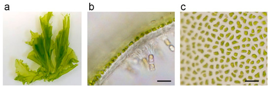 Seaweeds have traditionally been consumed by people inhabiting coastal areas in East Asia. Seaweed is rich in vitamins and minerals and is known to have many favorable effects on human health. There are three groups of seaweed, namely green algae, red algae, and brown algae. Green algae contain large amounts of chlorophyll, or green pigments such as those found in terrestrial plants. In contrast, red algae contain, in addition to chlorophyll, plenty of red pigments called phycoerythrin and blue pigments called phycocyanin, giving them a red or purple color [1,2]. Brown algae contain, in addition to chlorophyll, red–brown pigments called fucoxanthin and take on a yellowish brown or blackish brown color. The green alga Monostroma nitidum is often confused with a species of sea lettuces (Ulva Linnaeus). However, M. nitidum and sea lettuce belong to a different order in biological classification. Many species in the group of sea lettuces have a double layer of cells, whereas M. nitidum have a single layer of cell assemblies (Figure 1a,b) [3]. The Japanese name of M. nitidum Hitoegusa is derived from the fact that the leaf-like tissue is composed of a single layer of cells. M. nitidum thallus consists of many cell aggregates (Figure 1c), separated with mucilage rich in dietary fiber, vitamins, minerals, lipids, and peptides [3].