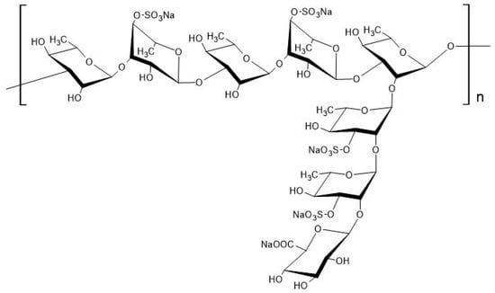 Chemical structure of rhamnan sulfate (RS) extracted from Monostroma nitidum. RS is a polysaccharide composed of linear chains of l-rhamnose (α-1,3 linkages) with branched chains (α-1,2 linkages), to which several sulfate groups are bound; reproduced from Tako et al. [7]. Reproduced with permission from SinencePG, 2020.