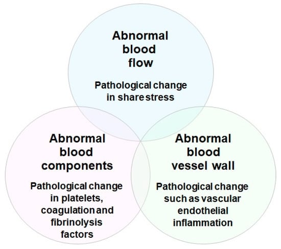 Risk factors for the development of thrombosis include aging, various environmental factors, clinical conditions, and stress. Thrombosis is a clinical condition that occurs when a pathological thrombus develops in the blood vessel. Platelet aggregation, blood clotting, and vascular endothelial inflammation are alleged to be three major factors closely related to thrombus formation in blood vessels (Virchow’s triad for thrombosis) (Figure 4) [30,31]. Rudolf K. Virchow in 1856 proposed that there are three essential factors contributing to the formation of arterial and venous thrombosis. They are pathological changes in (1) blood flow, such as abnormal increase and decrease of shear stress; (2) blood components, such as abnormal activation of platelets, blood coagulation, and fibrinolysis factors; and (3) vessel wall, such as abnormal vascular endothelial inflammation. Even today, these three factors are important in understanding the formation of arterial and venous thrombosis, and in developing medicines to treat and prevent thrombotic disorders [32,33].