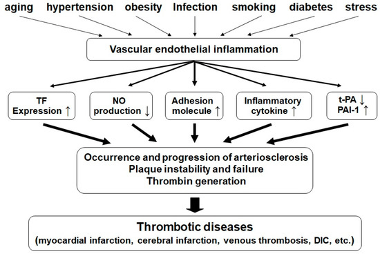 It has been recognized that the most important factors contributing to the formation of pathological thrombi in the blood vessels are pathological changes, such as inflammation of the vascular endothelium [34,35]. Factors such as aging, obesity, hypertension, diabetes, various types of stress, and smoking induce chronic damage to the endothelium. In general, normal vascular endothelial cells express various molecules that inhibit thrombus formation. Examples include thrombomodulin (TM), heparan sulfate proteoglycan, tissue factor pathway inhibitor (TFPI), and protein S, which inhibit blood coagulation; nitric oxide (NO), prostacyclin (PGI2), and ecto-ATP/ADPase, which inhibit platelet activation; tissue plasminogen activator (t-PA), which enhances fibrinolysis; and anti-inflammatory cytokines, IL-4, IL-10, NO, etc., as listed in Table 2, are expressed [35].