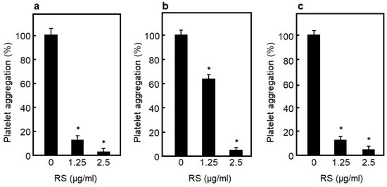 Formation of thrombi due to enhanced platelet aggregation is known to cause artery thrombosis [47,48]. To identify the effects that RS has on platelet aggregation, the effects of RS on human platelet aggregation in whole blood induced by collagen, thrombin, or an antibiotic ristocetin (one of the activators of VWF) were examined. As a result, as shown in Figure 6a–c, RS strongly inhibited collagen-, thrombin-, and ristocetin/VWF-induced platelet aggregation in a dose-dependent manner. RS has been shown to inhibit platelet aggregation in whole blood, and therefore is expected to be useful as a food for preventing arterial thrombosis.