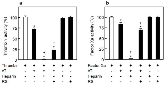 To elucidate the coagulation inhibitory mechanism of RS, its inhibitory effects on thrombin and factor Xa in the presence or absence of purified AT were analyzed. As shown in Figure 8a, the thrombin inhibitory effect was not observed in RS itself. However, similar to heparin, it inhibited thrombin activity in the presence of AT [14]. While heparin completely inhibited the activity of factor Xa in the presence of AT, RS inhibited only around 30% of factor Xa activity; the inhibitory effect of RS was thus weak compared to heparin (Figure 8b). The data show that RS strongly inhibits thrombin and weakly inhibits factor Xa in an AT-dependent manner. They also suggest that the anticoagulant effect of RS is driven by a molecular mechanism similar to that of unfractionated (polymeric) heparin.