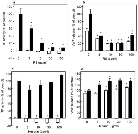 (a) Effect of various concentrations of rhamnan sulfate (RS) on tissue factor (TF) expression in HUVECs in the presence (■) or absence (□) of lipopolysaccharides (LPS) (10 μg/mL). (b) Effect of various concentrations of RS on von Willebrand factor (VWF) expression in HUVECs in the presence (■) or absence (□) of LPS (10 μg/mL). (c) Effect of various concentrations of heparin on TF expression in HUVECs in the presence (■) or absence (□) of LPS (10 μg/mL). (d) Effect of various concentrations of heparin on VWF expression in HUVECs in the presence (■) or absence (□) of LPS (10 μg/mL). Significant difference in values between the endothelial cells treated with LPS but without SC and the cells treated with LPS and various concentrations of RS is shown as * p < 0.01. Significant difference in values between the endothelial cells without SC and the cells treated with various concentrations of RS is shown as † p < 0.01. The data are cited from [14]. Reproduced with permission from Springer Nature, 2019.