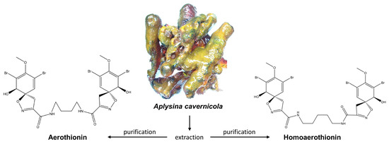 Sponges of the Verongiida order, such as Aplysina aerophoba and A. cavernicola, are characterized by the synthesis of brominated tyrosine derivatives (bromotyrosines) with, e.g., cytotoxic and multi-target activities [8]. According to the modern view, bromotyrosines can be produced by spherulocytes—specialized cells located within chitinous skeletal fibers of verongiids [9]. Two corresponding representatives are Aerothionin and Homoaerothionin, two tetrabromo spirocyclohexadienylisoxazoles with a wide range of biological activity (Figure 1) [10]. Aerothionin displayed a cytotoxic activity towards the cervical cancer (HeLa) [11,12] as well as breast cancer (MCF-7) cells [13] and was able to inactivate multidrug-resistant clinical isolates of Mycobacterium tuberculosis [14]. Moreover, Aerothionin showed the potential to inhibit the adenosine A1 receptor [12]. Both sponge-derived metabolites inhibit voltage-dependent calcium channels [15] and furthermore showed promising activity against the chloroquine-resistant strain of Plasmodium falciparum, the carrier of malaria [13]. Demosponges of the order Verongiida can be cultivated and represent renewable sources of unique 3D chitinous scaffolds [16,17], which are ready-to-use for various biomedical [18,19] and technological applications [9,20,21,22,23,24].