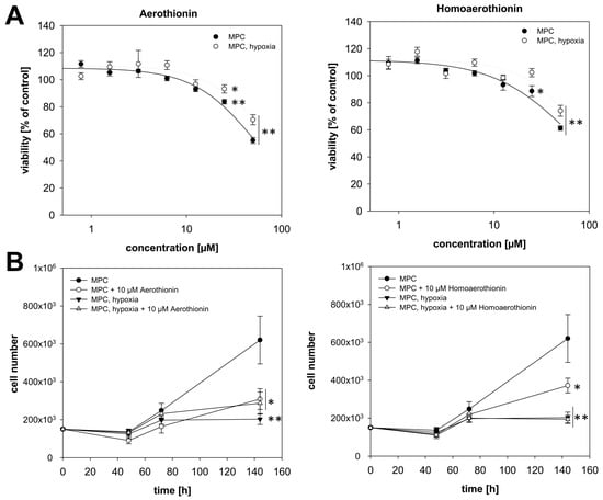 The impact of Aerothionin and Homoaerothionin on MPC cell proliferating properties. The impact of Aerothionin and Homoaerothionin on (A) MPC cell viability and (B) the number of proliferating MPC cells under normoxic and hypoxic conditions is shown. Four to five independent experiments were performed (n = 15–32). Mean±SEM; ANOVA and Bonferroni post hoc test comparison vs. control * p < 0.05, ** p < 0.001.