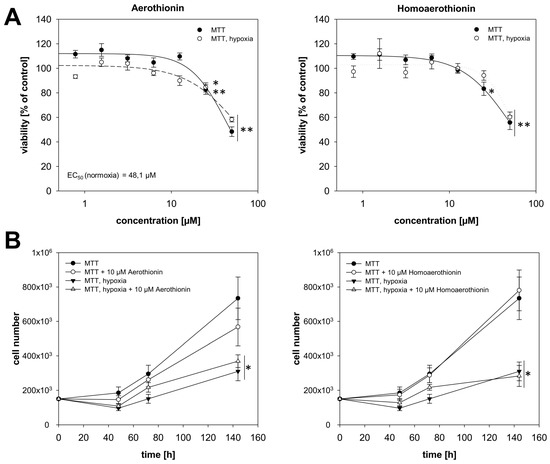 For confirmation purposes, we used a second pheochromocytoma cell line, named MTT that shows a more aggressive cell behavior. Treatment with at least 25 µM Aerothionin (RV25µM = 82.8 ± 3.9%; RV50µM = 48.3 ± 4.0%; Figure 3A) diminished RV under normoxic conditions significantly resulting in a half-maximal effective concentration (EC50) of 48.1 µM in these cells. Cultivation under hypoxia just slightly impaired the cellular response of the MTT cells towards Aerothionin (RV25µM = 84.5 ± 3.7%; RV50µM = 58.2 ± 2.0%). The number of proliferating MTT cells was not affected by the treatment with Aerothionin under normoxic and hypoxic conditions (Figure 3B). Homoaerothionin reduced the RV under normoxia (RV25µM = 83.3 ± 5.4%; RV50µM = 55.7 ± 5.7%) and hypoxia (RV25µM = 94.2 ± 3.9%; RV50µM = 60.3 ± 4.1%) to a comparable extent (Figure 3A). Similar to Aerothionin, treatment with Homoaerothionin (10 µM) had no effect on the number of proliferating MTT cells (Figure 3B).