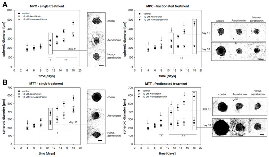 The impact of Aerothionin and Homoaerothionin on pheochromocytoma cell spheroid growth. (A) MPC and (B) MTT cell spheroids were treated with Aerothionin, Homoaerothionin, or DMSO as the control. A single treatment or a fractionated treatment regime was performed. Arrows mark the different treatment time points. Four independent experiments (n = 12) were performed. Mean ± SEM; ANOVA and Bonferroni post hoc test comparison vs. control * p < 0.05, ** p < 0.001. Scale bar: 200 µm.