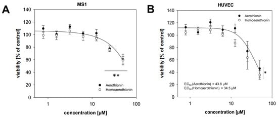The effects of Aerothionin and Homoaerothionin on endothelial cell viability. Dose-dependent effects of Aerothionin and Homoaerothionin on the cell viability of (A) mouse endothelial cell line, MS1, and (B) primary human umbilical vein endothelial cells (HUVECs) are shown. Four independent experiments (n = 12) were conducted. Mean ± SEM; ANOVA and Bonferroni post hoc test comparison vs. control * p < 0.05, ** p < 0.001.