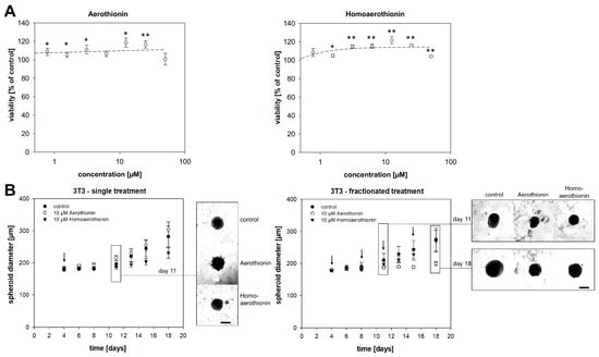 The impact of Aerothionin and Homoaerothionin on fibroblasts. (A) Treatment with either Aerothionin or Homoaerothionin stimulated the viability of the mouse fibroblast, 3T3. (B) 3T3 fibroblast spheroids were treated with Aerothionin, Homoaerothioin, or DMSO as the control. A single treatment or a fractionated treatment regime was performed. Arrows mark the different treatment time points. Scale bar: 200 µm. Four independent experiments (n = 12) were conducted. Mean ± SEM; ANOVA and Bonferroni post hoc test comparison vs. control * p < 0.05, ** p < 0.001. No significant difference was verified for 3T3 spheroids.