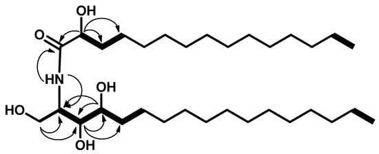 The 13C NMR spectrum (C5D5N, 100 MHz) of 1 showed 32 carbon signals. Characteristic resonances of a 2-amino-1,3,4,2′-tetrol unit of the hydrocarbon chain were observed at δC 52.7 (C-2), 61.8 (C-1), 76.5 (C-3), 72.7 (C-4), and 72.2 (C-2′). In addition, there was a resonance at δC 14.5 assigned for the two terminal methyl groups (C-17 and C-15′) and at δC 175.0 assigned for the amide carbonyl (C-1′). Analysis of the 1H-1H COSY, HMQC, and HMBC (Supplementary Materials, Figures S8–S10) spectra led to the assignment of all proton and carbon signals for compound 1. The positions of the hydroxy groups were confirmed by 1H-1H COSY correlations between 2H-1/H-2, H-2/H-3, H3/H-4, H-4/H-5, and H-2′/H-3′ and by the HMBC correlations of 2H-1/C-2, 2H-1/C-3, H-3/C-4, H-3/C-5, H-4/C-2, H-4/C-3, H-2/C-1′, and H-2′/C-1′, leading to the assignment of C-1, C-2, C-3, C-4, C-1′, and C-2′ (Figure 2).