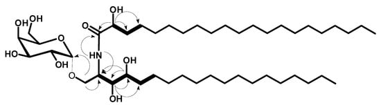 Compound 2 (Figure 1) was obtained as a white amorphous powder, and its molecular formula was determined to be C46H91NNaO10 by HRESIMS at m/z 840.6547 [M + Na]+ (calcd for m/z 840.6541), representing one degree of unsaturation (Supplementary Materials, Figure S11). The 1H and 13C NMR spectral data of compound 2 are listed in Table 1 and in the Supplementary Materials, (Figures S12–S18). The 1H NMR spectrum in (C5D5N, 400 MHz) displayed resonances of an amide proton doublet at δH 8.48 (1H, d, J = 8.4 Hz) and a long methylene chain’s protons at δH 1.25, representing a sphingolipid skeleton. Characteristic resonances of a 2-amino-1,3,4,2′-tetrol unit of the hydrocarbon chain were observed at δH 5.29 (1H, m), 4.63 (1H, m), 4.32 (1H, m), 4.59 (1H, m), 4.39 (1H, m), and 4.28 (1H, m) assigned for H-2, H-2′, H-1b, H-1a, H-3, and H-4 respectively. In addition, resonances corresponding to aliphatic methyl groups at δH 0.85 (3H, t, J = 6.8 Hz) assigned for CH3-19 and CH3-21′. The 13C NMR spectrum in (C5D5N, 100 MHz), showed 46 carbon signals. Characteristic resonances of a 2-amino-1,3,4,2′-tetrol unit of the hydrocarbon chain were observed at δC 50.4 (C-2), 72.4 (C-2′), 68.2 (C-1), 76.5 (C-3), and 72.3 (C-4). In addition, there was a resonance at δC 14.2 assigned for the two terminal methyl groups (C-19 and C-21′) and at δC 175.0 attributed to the amide carbonyl (C-1′). The 13C NMR spectrum revealed the presence of an anomeric carbon δC 101.2 together with the characteristic signals at δC 70.2, 71.6, 71.0, 73.1, and 62.6 indicating the presence of a sugar moiety. The structure of compound 2 was characterized by comparison of its 13C NMR spectral data with those of the known cerebroside, agelasphin, possessing a 2-hydroxy fatty acid group [21,22]. The 1H NMR signal at δH 5.61 (d, J = 3.4 Hz) clearly indicated that the galactose had an α-linkage [21]. Analysis of the 1H-1H COSY, HMQC, and HMBC (Supplementary Materials, Figures S19–S21) spectra led to the assignment of the proton and carbon signals for compound 2. The positions of the hydroxy groups were confirmed by 1H-1H COSY correlations between 2H-1/ H-2, H-2/H-3, H-3/H-4, H-4/2H-5, and H-2′/2H-3′ and from HMBC correlations of 2H-1/C-2, 2H-1/C-3, H-3/C-4, H-3/C-5, H-4/C-2, H-4/C-3, H-2/C-1′, and H-2′/C-1′, leading to the assignment of C-1/C-2/C-3/C-4/C-1′/C-2′ (Figure 3).