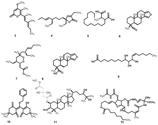 Chemical structures of the annotated metabolites from Stylissa carteri, cyercene (3), plakortone G (4), pedicellic acid (5), spongia-13(16),14-dien-19-al (6), plakortin (7), spongia-13(16),14-dien-19-oic acid (8), 9,10,11-trihydroxy-(12Z)-12-octadecenoic acid (9), benzylthiocrellidone (10), methyl aeruginosate C (11), and salarin B (12).