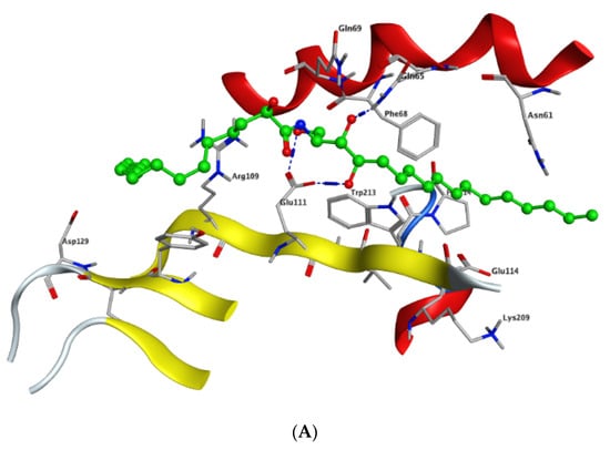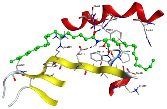 Modeling and docking simulations of the newly isolated compounds (1 and 2) were performed using the Molecular Operating Environment (MOE) software [39] and the crystal structure of Su(var)3–9, enhancer of Zeste, Trithorax (SET)/inhibitor 2 of protein phosphatase 2A (I2PP2A) oncoprotein; (PDB: 2E50) [40]. D-erythro(e)-C18 ceramide was chosen as a reference compound in the simulation studies due to its higher affinity for binding to SET protein compared to other endogenous ceramides or sphingosine [41]. PP2A has been reported to exhibit a tumor suppressive function by inducing apoptosis or programmed cell death in various cancerous cells [42]. Sphingolipid ceramide has long been described to activate PP2A through a direct interaction with the PP2AC catalytic domain [43], but its mechanistic details have so far remained unknown. Alternatively, another mechanism of ceramide-induced activation of PP2A has been recently found to proceed through the direct binding of ceramide with SET oncoprotein, which functions as an inhibitor of tumor suppressor PP2A [41]. Because the crystal structure of the ceramide-SET complex was not available in the protein data bank, induced fit docking was performed using the crystal structure of the SET protein and C18 ceramide as a flexed ligand. The top generated pose (S = −4.5237 kcal/mol) of the initial flexible docking revealed that the C18 ceramide chain of 1 interacts at the hydrophobic binding pocket along the space between the helix of the dimerization domain and the β sheets within the protein structure. The pocket is predominately lipophilic with some regions of hydrophilicity (Figure 5). Furthermore, our simulation results showed that the ceramide molecule adopts an “extended” conformation inside the SET protein, in which the sphingosine and lipid chains are placed in opposite directions. This finding was further confirmed by the NMR model suggested previously by De Palma et al. [41]. The docking results of compound 1 revealed that the ligand exhibited a similar extended orientation and comparable binding interactions within the pocket (S = −6.6821 kcal/mol). The lipid chain of compound 1 forms hydrophobic interactions with the amino acid residues Phe-68, Tyr-127, Pro-214, and Trp-213. Additionally, along the N-terminal region, the 1,4-dihydroxy array of the dihydrosphingosine chain donates two H-bonds to Glu-111 (2.843 and 2.849 Å, respectively), while the 3-hydroxy group accepts an H-bond from Gln-65 with 2.138 Å (Figure 6A). Previous data had indicated that the amino acid residues 36–124 of the N-terminal region are involved in the inhibition of PP2A as well as the binding with ceramide [41]. On the other hand, compound 2 was found to exhibit a different compact conformation within the active site, where the dihydrosphingosine backbone runs perpendicular to both the fatty acyl chain and the sugar moiety. Therefore, compound 2 showed a weaker binding pattern within the pocket (S = −9.2672 kcal/mol) (Figure 6B). The lipid chain of compound 2 forms hydrophobic interactions with the amino acid residues Phe-68, Phe-67, and Pro-214. The longer chains of compound 2 destabilize the complex by shifting the ligand from the main binding sites within the SET structure. The hydroxy group of dihydrosphingosine chain donates an H-bond to the amide carbonyl group of Val-112 (2.78 Å), the 4-OH of lipid chain donates an H-bond to Asn-61 (2.77 Å), and the CH2OH of the sugar moiety projects out the active site and donates an H-bond to Glu-116 (2.91 Å).