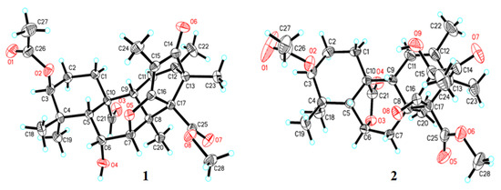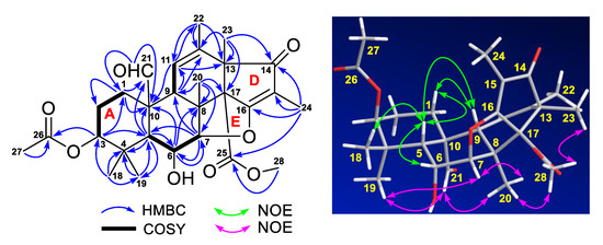 Compound 1 was obtained as monoclinic crystals and had a molecular formula C28H36O8 deduced from its HRESIMS ions at m/z 499.2340 [M – H]– (calcd for C28H35O8, 499.2332) and 501.2482 [M + H]+ (calcd for C28H37O8, 501.2488). The infrared radiation (IR) spectrum showed characteristic bands for hydroxy (νmax 3526 cm−1) and carbonyl (νmax 1736, 1716, 1698, and 1660 cm−1) functional groups. The downfield 13C NMR spectrum showed eight signals for four carbonyls (δC 207.7, 201.1, 169.6, 168.3) and two pairs of double bonds (δC 185.3, 133.9, 120.5, 111.6) (Table 1). These NMR data accounted for six out of the 11 degrees of unsaturation required by the molecular formula and the remaining five suggested that the structure of 1 had five rings. In the correlation spectroscopy (COSY) spectrum, three spin systems of H2-2 (δH 1.47, m) with H2-1 (δH 2.31, dt, 13.5, 3.2 Hz; 0.79, td, 13.5, 4.5 Hz) and H-3 (δH 4.42, t, 3.1 Hz), H-6 (δH 4.52, t, 2.8 Hz) with H-5 (1.79, d, 2.8 Hz) and H-7 (δH 4.67, d, 2.8Hz), and H-9 (δH 2.05, br s) with H-11 (δH 5.60, br s) were observed (Figure 3). Heteronuclear multiple bond correlation (HMBC) spectrum showed the following correlations (Figure 3): H-1 (δH 0.79) with C-2 (δC 22.4), C-10 (δC 51.5), and C-21 (δC 207.7); H-3 with C-1 (δC 28.5), C-5 (δC 45.8), and C-26 (δC 169.6); H-5 with C-4 (δC 36.8), C-6 (δC 66.0), C-10, C-19 (δC 23.0), and C-21; H-6 with C-7 (δC 91.9), C-8 (δC 45.6), and C-10; H-7 with C-5, C-6, C-8, and C-9 (δC 50.1); H-9 with C-11 (δC 120.5) and C-12 (δC 133.9); H-11 with C-10, C-13 (δC 52.9), and C-22 (δC 20.2); H3-18 (δH 0.97, s) with C-3 (δC 77.4), C-4, C-5, and C-19; H3-19 (δH 1.09, s) with C-3, C-4, C-5, and C-18 (δC 25.3); H3-20 (δH 1.12, s) with C-7, C-8, C-9, and C-17 (δC 68.5); H3-21 (δH 10.55, s) with C-1, C-10, and C-20 (δC 15.5); H3-22 (δH 1.75, s) with C-11, C-12, and C-13; H3-23 (δH 1.13, s) with C-12, C-13, and C-17; and H3-27 (δH 1.93, s) with C-26. These COSY and HMBC correlations established the partial structure of rings A–C (a 6/6/6 tricyclic fusion) with an acetyl group at C-3, two oxymethines at C-6 and C-7, an aldehyde group at C-21, and five methyls at C-18, C-19, C-20, C-22, and C-23, respectively. In addition, HMBC correlations of H3-23 with C-12, C-13, C-14 (δC 201.1), and C-17, H3-24 (δH 1.57, s) with C-14, C-15 (δC 111.6), C-16 (δC 185.3), and C-25 (δC 168.3), and H3-28 (δH 3.69, s) with C-25 were also observed, indicating the C/D/E ring juncture with a keto at C-14, a methyl at C-24, and a methoxy at C-28. Although no HMBC correlation of H-7 with C-16 was observed, the downfield chemical shifts at δC 91.9 for C-7 and δC 185.3 for C-16 suggested a five-membered ether ring for E, which was confirmed by the crystal structure (Figure 2) of 1 obtained from a single crystal X-ray diffraction.