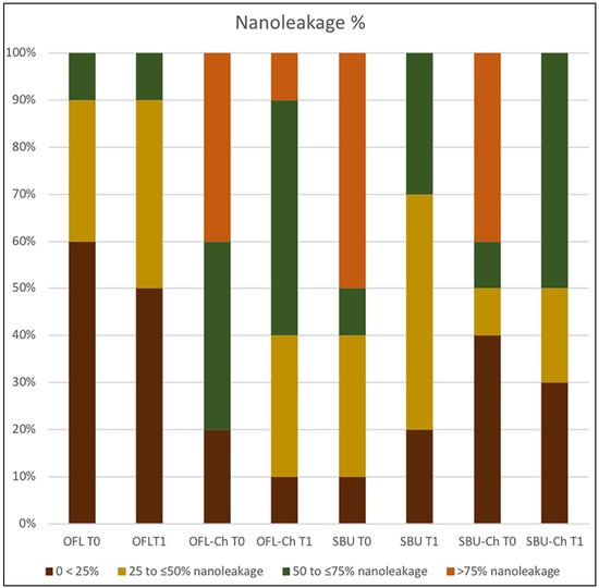 The four 2 × 4 contingency tables depicting the nanoleakage scores from the four subgroups are shown in Table 3, Table 4, Table 5 and Table 6. For OFL and OFL-Ch, the sum of the probabilities of the observed array of cell frequencies, together with the probabilities of all other cell frequency arrays that are less than or equal to the probability of the observed array (i.e., PA) for T0 is 0.0095 and for T1 0.0069. There was a statistically significant association between the method in which the specimens were bonded and the nanoleakage score (p < 0.05). Nevertheless, for SBF and SBF-Ch, the probability of the observed array of cell frequencies plus the sum of the probabilities of all other cell frequency arrays are equal to or smaller than the probability of the observed array (i.e., PA) for T0 is 0.5726 and for T1 05226. A statistically significant association between the method in which the specimens were bonded and the nanoleakage score was not found (p > 0.05). The percentage distribution of nanoleakage is shown in Figure 1.