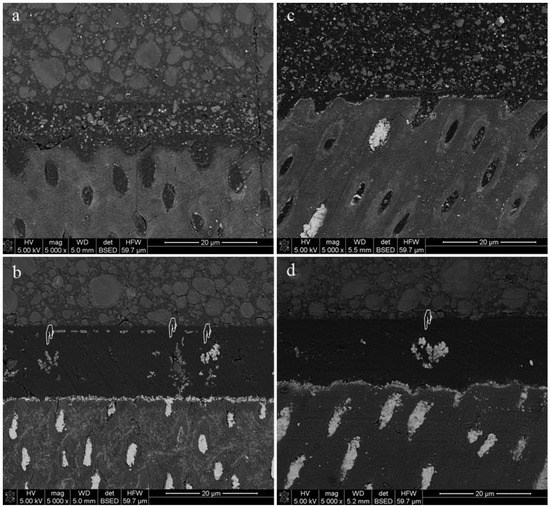 Scanning electron microscopy images of representative nanoleakage expression (pointers) along the resin–dentine interface created by different adhesives in the presence or absence of Ch pretreatment. OFL: Optibond FL; SBU: Scotchbond Universal. (a) OFL at time T0. (b) OFL-Ch at time T0. A spotted pattern was identified for these experimental subgroups. (c) SBU at time T0. (d) SBU-Ch at time T0. A more defined linear nanoleakage pattern was observed for these subgroups. Silver depositions were more continuous and water channels (i.e., water channels; pointers) were detected within the adhesive layers.