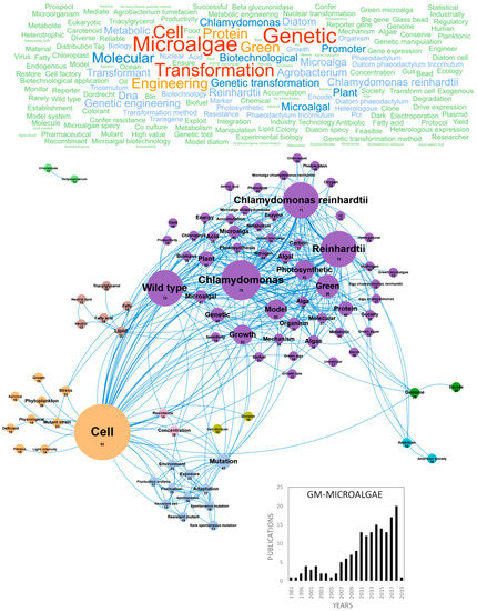 Main concepts, concepts network and annual number of European scientific publications related to genetically modified microalgae (GM-microalgae) in 166 publications (400 links; 28 coocc; 12 occ; and 9 clusters).