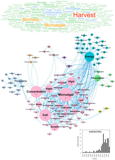 Main concepts, concepts network and annual number of European scientific publications related to the microalgae harvesting in 175 publications (400 links; 7 coocc; 8 occ; and 8 clusters).