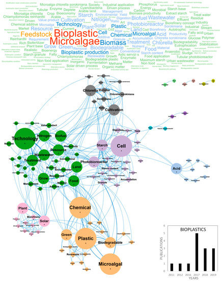 The huge accumulation of plastic waste in the world is driving international demand and stimulating research for the production of renewable and biodegradable plastics [67]. Particularly, the ubiquitous and persistent presence of microplastics in the oceans represents a serious threat for the marine environment, affecting trophic networks from microalgae to superior predators. A direct toxicity of microplastics on microalgae has been demonstrated, even at very low concentrations (in the ppm range) and can be partly explained by their adsorption and aggregation on cells inducing chlorophyll and photosynthesis reduction, oxidative stress, morphological changes and growth inhibition, eventually impacting all marine food webs [68,69]. In this context, microalgae biomass is considered an innovative eco-friendly resource for producing bioplastics, mainly using polyhydroxyalkanoates (PHA) as a raw material. It can be used directly or as a feedstock for secondary processes with existing infrastructures and processes [70]. Publications reviewing and studying the different kinds of microalgae-based bioplastics, their chemical properties, their markets and the key barriers limiting their development are currently emerging in the literature. Figure 5 shows the word clouds of the main concepts contained in the European scientific publications, networks and clusters established between these concepts and the temporal production of these publications. Only 3–5 papers were published per year on the topic of bioplastics since 2017 and the number is growing, with three papers already published in the first two months of 2019. Germany and Italy were the main countries publishing microalgae-based bioplastics studies with five and four publications, respectively (Figure 10b). The main concepts emerging from this European database on bioplastics were microalgae, bioplastic, feedstock, biomass and bioplastic production (Figure 5). By dismissing these ubiquitous concepts, a network of 11 differentiated clusters was created. A first descriptive cluster in orange characterizes the eco-friendly advantage of microalgae in the field of bioplastics by bringing together the chemical, plastic, green, biodegradable, renewable and bioeconomy concepts. Publications also highlighted the advantages of bioplastics for industrial application and compatibility with the establishment of a circular bioeconomy which is beginning to develop [67,71]. Among the expanding microalgae circular bioeconomy trend in which companies are also involved for bioplastics, this cluster underlines Europe’s current concern for ecology, the need for new greener options for the production of chemicals and polymer materials, combined to the limitation of arable land use, contribution to CO2 capture and waste/byproducts use [71]. A second cluster in green highlights the technical description of concepts related to microalgae cultivation for bioplastics including technology, wastewater, nutrient, treatment and productivity. Nutrient management in microalgae culture to produce bioplastics is a key point linked to the use of wastewater and many studies dedicated to microalgae culture for the production of biofuel also discussed wastewater treatment [62]. The photobioreactor concept highlighted studies dedicated to the physiological orientations of microalgae metabolism to produce bioplastics and made the link with the purple cluster related to starch accumulation in microalgae, containing the cell, starch, cultivation and accumulation concepts. When microalgae cells are placed in stress conditions in the culture medium, particularly in nutrients depletion conditions (nitrogen, sulfur or phosphate), they accumulate biopolymers [72,73,74] such as polysaccharides, including starch [75,76], lipids [6,77], proteins [78], pigments [79] and other metabolites. Research also aims at giving a proof-of-concept for the production of microalgae-based bioplastics. A recent study has shown that some strains of Chlamydomonas reinhardtii can produce up to 49% w/w of starch in a sulfur-deprived medium and demonstrated the feasibility of up-scaling microalgae starch to small-scale production in 30 L tubular photobioreactor [80]. The starch-rich biomass presented interesting plasticization capacity and in-depth analysis of conditions and protocols of microalgae plasticization were discussed [61]. Another cluster in grey highlights which microalgae species were studied for the production of bioplastics. Chlorella sorokiniana was the most cultivated species in these studies and the following concepts were dominant: Chlorella, cultivation and ratio. Chlamydomonas sp. was also very studied and associated to the cluster dealing with starch accumulation and proof of concept. An isolated cluster in pink highlights the biorefinery, solar and methane concepts. One way to connect the microalgae biomass feedstock into the existing petrochemical-based plastics industry is to convert biomass to methane through fermentation. A wide range of chemical reactions have thus been developed to further convert methane into precursors for bioplastics production. Methane can be used to produce polyhydroxyalkanoates or PHAs, lactic acid (precursor to polylactic acid or PLA), ethanol (precursor to bio-polyethylene or bio-PE and bio-poly vinyl chloride or bio-PVC) and proteins (precursor to proteins-based polymers). Finally, another cluster could be differentiated around the concepts of acid and fermentation that highlighted the importance of PLA in the current global economy. Polylactic acid (PLA) is a thermoplastic aliphatic polyester derived from renewable biomass and typically obtained from fermented plant starch such as corn, cassava, sugarcane or sugar beet pulp. In 2010, PLA was the second most consumed bioplastic in the world. [67]. The emerging concepts associated to the bioplastic database were acid, biorefinery, cultivation, digestion, accumulation, anaerobic, bioeconomy, biorefinery c