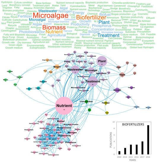 The potential of algae-based biofertilizers and biostimulants in agriculture has been increasingly recognized during the recent years. Biofertilizers can provide cost-effective alternatives to synthetic products and renewable and eco-friendly solutions for the future of agriculture. They exhibit a high potential for biostimulation and improvement of crop productivity, improvement of soil fertility and protection against abiotic stresses [81]. The global increase of population and water consumption, the decrease of water supply in some geographic areas, terrestrial and underground water pollution and climate change are currently generating a water crisis that stimulates the research on plant nutrition, wastewater recycling and management of nutrient cycles. In this context, the eco-friendly production of microalgae-based biofertilizers appears as a realistic alternative for the environmental management of wastewater combined to the supply of nutrients for crops [82]. The number of publications that review and study microalgae-based biofertilizers has increased in recent years and the two main countries publishing in this topic were Spain and Italy (Figure 10c). Figure 6 shows the word clouds of the main concepts contained in microalgae scientific publications dealing with biofertilizers, networks and clusters established between these concepts and the temporal production of these publications. The number of publications increased linearly since 2014 reaching nine publications per year in Europe in 2018. The main concepts that emerged from this European database were microalgae, biofertilizer and biomass (Figure 6). After dismissing these ubiquitous concepts, 10 clusters could be highlighted. The nutrient concept in pink, located at the center of the biofertilizer concepts network, is linked to the cluster including productivity, nitrogen, phosphorus, photobioreactor, optimal condition and biofuel. Nitrogen, phosphorus and potassium (NPK) are indeed the top three primary nutrients used as commercial fertilizers [83]. They are also the top three nutrients studied for microalgae growth, to produce microalgae biomass that can be transformed into biofuels or biofertilizers. Nutrient removal yields by microalgae were studied with the aim to achieve an integrated nutrient management (INM) fulfilling environmental regulation. Optimization of microalgae growth conditions to obtain efficient nutrients removals at industrial scale was performed by designing new photobioreactors, such as semi-closed 30 m3 horizontal photobioreactors [82]. The treatment of urban or industrial waste waster by microalgae is an option at industrial scale in USA and Europe and it was also considered from the technological and energetical points of view, in an objective of agricultural valorization, as evidenced by the purple cluster grouping the wastewater, agricultural, urban, technology and energy concepts. Minor clusters such as biogas in orange, including the biogas, reuse and sludge concepts or that of digestion in blue-green including the digestate, digestion and anaerobic concepts, highlight the interest of the microalgae wastewater bioremediation to produce biomass that can be valorized into ethanol, biohydrogen and biogas [71]. Studies were also conducted to identify the microalgae species combining the best bio-remediation and biofertilizing capacities. For example, Chlorella sp. was shown to present high phytostimulating activities on wheat (30% increase in plant length) and proposed as a possible substitute to chemical fertilizers to increase soil fertility [82]. Nannochloropsis sp. was also identified as a sustainable biofertilizer increasing the sugar and carotenoid contents in tomato [84]. The blue cluster containing the Chlorella concept shows that the majority of scientific publications dealing with biofertilizers used Chlorella sp. as a model species [85]. The scientific community was also interested by Acutodesmus sp., Scenedesmus sp., Phaeodactylum sp. and Pavlova lutheri. Biofertilizers studies also focused on microalgae harvesting, as illustrated in the light green cluster including the harvest, substrate and material concepts. The algal biomass is usually harvested during the exponential growth phase to obtain maximum growth yields and a better amino acid profile in order to have an efficient biostimulant activity. The biomass was recovered by centrifugation or filtration and some studies on biofertilizers tested electrocoagulation [82]. Last, the emerging concepts of the biofertilizers database were photobioreactor, carbon, digestate, microalgae biomass, photosynthetic, protein, agriculture, anaerobic, biogas production, carbohydrate, centrate, chemical, culture medium, cyanobacteria, digestion, dilution, matter and maximal nutrient removal. These concepts only represented a maximum of three publications per year until 2016 because of the youth of this research topic but pointed out an interest for the innovative use of cyanobacteria as possible biofertilizers. Finally, Win et al. (2018) also pointed out the main limitations in the development of microalgae-based biofertilizers, namely the short shelf life of biomass and need for expensive cold storage [83].