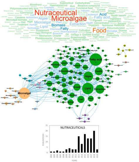 Microalgae and cyanobacteria have been used as human food for hundreds of years; for example, Aztecs consumed Spirulina (Arthrospira sp.) from Lake Texcoco in Mexico around 1300 AD [86]. Today only few species (GRAS species) have obtained authorization for human food but microalgae and cyanobacteria attract the attention of researchers and consumers because they contain a wide range of nutrients and bio-active compounds, including proteins, polysaccharides, lipids, pigments, polyphenols, minerals and vitamins of high nutritional value. Consumption of whole dried microalgae and cyanobacteria has greatly increased during the last 20 years and they are now considered as an eco-friendly/organic sustainable food, alternative and complementary to “classical” food, with health-promoting properties [86]. More recently, in the 2010s, microalgae- and cyanobacteria-based food supplements or nutraceuticals started to be produced and marketed. Lipids (polyunsaturated fatty acids (PUFAs): EPA and DHA) and pigments (carotenoids) largely dominate these markets. Nutraceuticals can be defined as food nutrients that not only supplement the diet but also facilitate the prevention or treatment of diseases and disorders, according to the producers’ claims. Recent papers have reviewed the state of the art about the biotechnological production and use of microalgae [87,88], with a particular focus on their use for food and feed [89,90,91] or nutraceuticals [92,93,94,95]. In Europe, the two main countries publishing in the nutraceuticals field were Italy and Spain with 29 and 26 publications, respectively (Figure 10d). Figure 7 shows the word clouds of the main concepts contained in scientific publications dedicated to microalgae nutraceuticals, networks and clusters established between these concepts and the temporal production of these publications. The figure shows that the scientific community interest in microalgae nutraceuticals started in 2013, with about 15 publications/year. The five dominant concepts were nutraceutical, microalgae, food, biomass and acid. These major and ubiquitous concepts were dismissed to obtain a more detailed network of concepts, including nine clusters in Figure 7. The main cluster identified in green is dominated by the antioxidant, antiviral and bioactive compounds concepts and grouped all microalgae molecules and bioactive substances identified as nutraceuticals. Among the nutraceutical supplements or functional food of this cluster, fatty acid, PUFAs, rich and carotenoids overlook widely and their concepts networks are tightly connected. Microalgae constitute natural sources of omega-3 or PUFAs that have unequivocally proved to improve human health and limit diseases (e.g., cardiovascular disorders, cancer, type 2 diabetes, inflammatory bowel disorders, asthma, arthritis, skin disorders, depression and schizophrenia). Due to a clear wild fish capture over exploitation in the last few years and their use as a raw material for oil production (specifically ω3 oils), purification of PUFAs from microalgae to produce omega-3 capsules has attracted attention since 2013, a time when fish oil and terrestrial vegetables (e.g., flaxseeds) were the only source used to obtain them.