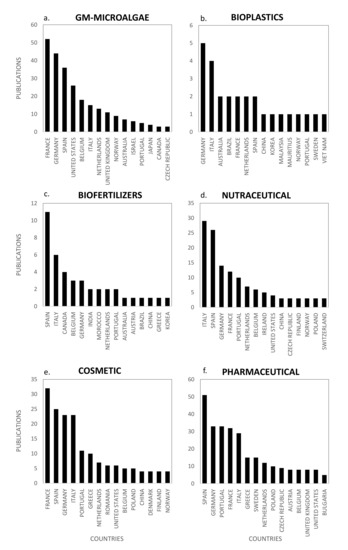 Scientific production by country for the emerging markets of: GM-microalgae (a); bioplastics (b); biofertilizers (c); nutraceutical (d); cosmetic (e); and pharmaceutical (f).