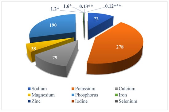 Average mineral composition (mg) of fish []. * []; ** []; *** [].