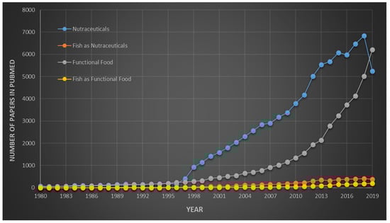 Stephen DeFelice first coined the word “nutraceutical” by combining two words “nutrition” and “pharmaceutical”. He defined nutraceutical as food or a part of food which not only imparts health benefits but also contributes to preventing/treating various diseases [,]. Moreover, in broad terms, nutraceuticals play a vital role in human beings by maintaining their normal physiological functions and well-being. Although fish has always been superior and dominant on other protein nutraceuticals and functional foods, research programs on fish-based nutraceuticals and functional foods have reached a saturation point. Even awareness related to its benefits is lacking and should be underpinned []. Awareness programs only reach the urban population of countries and somehow the rural population is excluded. Moreover, based on a PubMed search using keywords like nutraceuticals and functional foods, a number of research articles were published at a rapid pace since 1995. However, a change in the search of keywords to fish as nutraceuticals/functional food, the rate of publication has been fairly stagnant since 1980 (Figure 3). This shows the saturation level of this field of study which is a matter of concern.