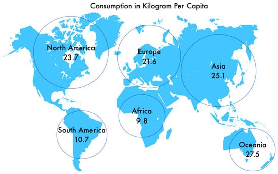 The global nutraceutical market comprised of functional foods and dietary supplements was valued at around $250 billion in 2014. Consumer demand for nutraceuticals is rapidly increasing with the market expected to reach $722.49 billion by 2027 according to a current report by Grand View Research, Inc. [,,]. Global fish nutraceutical markets comprise mainly of fish oil, as it is the most widely used nutraceutical for human consumption, because of its high content of essential long-chain omega 3 fatty acid. According to the report published by Global Fish Oil Market, the global fish oil market is expected to reach $4.08 billion by 2022 according to a new report by Grand View Research, Inc. []. Moreover, other nutraceutical products derived from fishes include collagen, bioactive peptides, protein hydrolysate, carotenoids, and glycosaminoglycans. Figure 4 provides insight about the current fish consumption in kilogram per capita. Africa, with the most least-developed countries in the world, has the smallest consumption rate of fish or fish products. The scientific community and nutraceutical producing global leaders are urged to find a way to use fish wastes and its by-products for developing low-cost nutraceuticals that fulfill almost all the nutritional requirements of a human being. This can be supplied to the least developed nations with properly organized awareness programs by lead organizations like the World Health Organization (WHO).