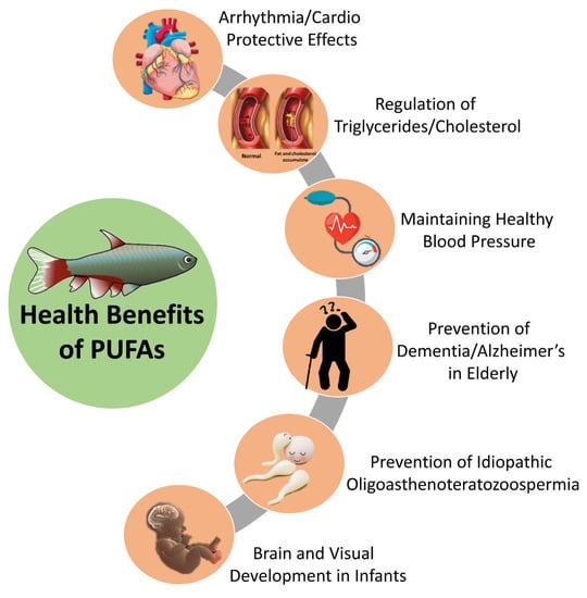 It has been observed that therapeutically important omega-3 PUFAs prevent childhood asthma as well as attention deficit/hyperactivity disorder in children. Moreover, in adults it has been well documented for the prevention of cardiovascular diseases, hypertension, and idiopathic oligoasthenoteratozoospermia. Additionally, in geriatrics, it helps in preventing dementia, age related macular degeneration, Alzheimer’s disease, as well as mood disorder [,]. The EPA and DHA fatty acids found in fish also exhibit anti-inflammatory properties through their impact on prostaglandin synthesis [,]. For pregnant women, mothers who are breastfeeding, and women of childbearing age, fish intake is highly recommended and important, because it supplies DHA, a specific omega-3 fatty acid that is beneficial for the brain development of infants []. Other benefits include anticoagulant effect, help in thinning the blood, as well as antidepressant []. The health benefits of omega-3 fatty acids are well-known to scientific, clinical, and industry experts, with research examining effects on almost every body system and for numerous health conditions as mentioned in Table 1 and Figure 5.