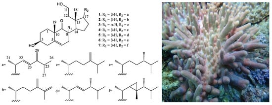 - Chang, Y.C.; Kuo, L.M.; Su, J.H.; Hwang, T.L.; Kuo, Y.H.; Lin, C.S.; Wu, Y.C.; Sheu, J.H.; Sung, P.J. Pinnigorgiols A–C, 9,11-secosterols with a rare ring arrangement from a gorgonian coral Pinnigorgia sp. Tetrahedron 2016, 72, 999–1004. [Google Scholar] [CrossRef]