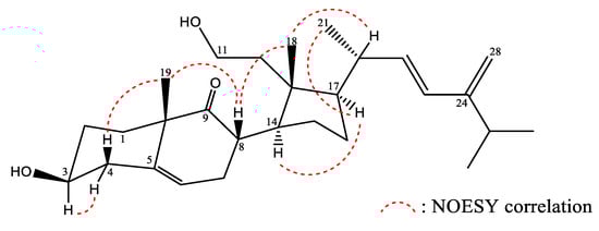 The relative stereochemistry of 1 was explained in terms of correlations observed in a nuclear Overhauser effect spectroscopy (NOESY) experiment, and through a comparison of NMR data between 1 and known secosterol 5. The results suggest that these two compounds possess the same 9,11-secosterol skeleton as well as the same core A-, B-, and D-rings [5]. The configurations at C-3, C-8, C-10, C-13, C-14, and C-17 in 1 were found to be identical to those of 5. Key NOESY correlations for 1 displayed interactions between H-8/H3-18 and H-8/H3-19. Thus, H-8 should be located on the β-face (Figure 3). A large coupling constant (J = 16.0 Hz) indicated a trans relationship between H-22 and H-23. All these data allowed to identify compound (1) as depicted in Figure 1 and it was named sinleptosterol A.