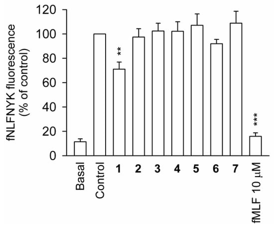 FPR1 receptor binding assay of compounds 1–7 in human neutrophils. Data are representative of three experiments. ** p < 0.01, *** p < 0.001 versus the control group.
