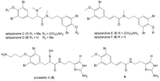 - Kobayashi, J.; Honma, K.; Tsuda, M.; Kosaka, T. Lipopurealin-D and Lipopurealin-E and Purealidin-H, New Bromotyrosine Alkaloids from the Okinawan Marine Sponge Psammaplysilla purea. J. Nat. Prod. 1995, 58, 467–470. [Google Scholar] [CrossRef]