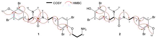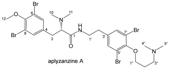 Aplyzanzine C (1) was obtained as a colorless varnish. Its HRESIMS data showed a [M + H]+ ion cluster at m/z 726, 728, 730, 732, and 734 in a 1:3:5:3:1 ratio, indicating the presence of four bromine atoms in the molecule. Analysis of the [M + H]+ peak at m/z 729.9170 suggested a C24H31N3O3Br4 formula for 1, indicating nine degrees of unsaturation. The 1H-NMR spectrum (CD3OD, Table 1) showed signals concerning four aromatic protons between δH 7.45 and 7.55, and three methoxyl protons at δH 3.84/3.79, all of these doubled in a ~3:1 ratio (only the predominant signals are mentioned in the table). The 13C NMR spectrum revealed the presence of only one carboxyl at δC 168.3, and eight signals between δC 119.1 and 155.7, similar to those reported for aplyzanzine A []. The analysis of the 2D NMR experiments, including 1H-1H COSY, 1H-13C HSQC, and HMBC, allowed us to confirm the similarities with the main structure of aplyzanzine A (Figure 2), with a dibromo-methoxytyrosine part, a para-N-ethyl-dibromophenol moiety linked to a propylamine group.