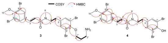 Aplyzanzine E (3) is a minor colorless compound obtained from both the precipitate and the butanolic phases. The HRESIMS data showed the [M + H]+ ion as a cluster at m/z 681, 683, 685, 687, and 689 mu, indicating the presence of four bromine atoms in the molecule again. Analysis of the [M + H]+ peak at m/z 684.8616 suggested the molecular formula C22H24N2O3Br4 for this compound, indicating ten degrees of unsaturation. The difference of molecular formulae with aplyzanzine C (1) suggested the loss of the dimethylamine fragment. The same dibromophenolic moieties found in aplyzanzine C (1) were observed on the 1D and 2D NMR spectra (Table 2). This was confirmed by the lack of the signals of N(CH3)2 at δH 2.91 (δC 42.7) on the 1H NMR spectrum of compound 3 but present on the spectrum of compound 1. Regarding the UV spectra of compounds 1–3, aplyzanzines C (1) and D (2) exhibited the same UV spectra with a maximum of absorption at 207 nm (in MeOH), but the spectrum of aplyzanzine E (3) displayed two maxima at 207 and 284 nm, suggesting the presence of additional π system confirmed by NMR signals of two olefinic protons at δH 6.96 (δC 138.4) and δH 6.60 (δC 120.7). Their coupling constant of 15 Hz is characteristic of a trans configuration of the double bond between CH-2 and CH-3. HMBC correlations of these two protons with the aromatic C-4 at δC 133.3 and the amidic carbonyl C-1 at δC 168.9 allowed to assign the position of this double bond between these two fragments. These data are consistent with those reported for psammaplysenes [,,], which also contain a CH-2-CH-3 double bond. All these observations led us to assign the structure 3 to aplyzanzine E (Figure 4).