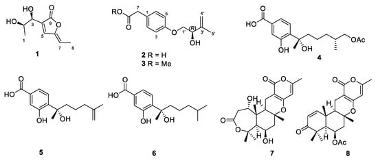 In addition, another five previously reported metabolites including bisabolane-type sesquiterpenoids 4–6 and meroterpenoids 7 and 8 were also isolated in this study. They were identified as (7S,11S)-(+)-12-acetoxysydonic acid (4) [], (S)-(+)-11-dehydrosydonic acid (5) [], sydonic acid (6) [], asperdemin (7) [], and asperversin G (8) [], respectively, by comparing their NMR data with those from the literature.